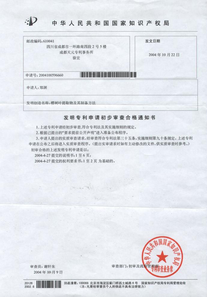 本发明公开了属蔷薇科的、叶可食用的樱树叶提取物及其制备方法,樱树叶的乙醇提取物包括樱之素和樱膏,其制备方法主要包括:盐渍樱叶、干燥、粉碎、萃取和浓缩等几个步骤;这三种提取物可广泛应用于食品、酒类、日用化工、制药及保健品技术领域;它们充分保存了樱花树叶的特有组份及特殊香味;该樱树提取物,绿色环保,适口性好,在迎合了日本人传统的饮食消费习惯的同时,还符合绿色、纯天然的国际消费时尚;本发明属于食用樱树叶深度开发技术领域基础性、首创性发明,开创了一个全新的技术领域,对樱树叶进行深度开发并进行综合利用,产品全部出口日本,并形成了对日本同行业巨大的技术优势。