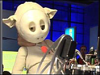 与有“心”的智能人一起展出的是一个智能蜘蛛,编程使它能识别人的面部特征,然后跟随人移动。