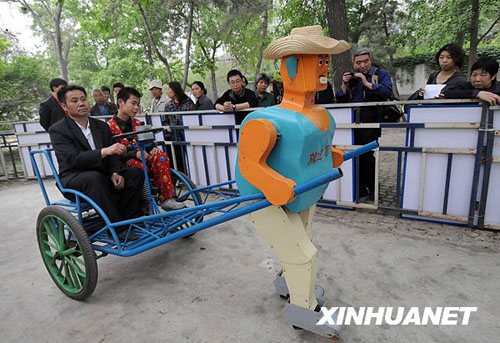 当日,由农民机器人发明家吴玉禄研发的35个机器人在北京大观园亮相。吴玉禄是北京通州区一位普通农民,多年来已发明研制了35个机器人。这些机器人形态各异,各有所长,分别具有蹦、跳、翻跟头和拉车、爬墙、端茶倒水等功能。新华社发(郑永 摄)