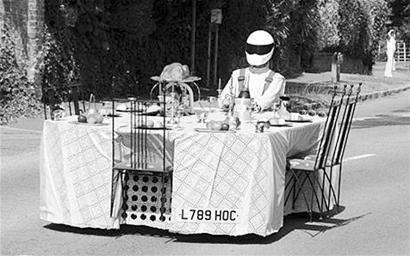 英国发明家沃特金斯上周驾驶着他的安妮皇后式餐桌,在诺丁汉郡的一段500米长的公路上高速行驶了一个来回。现年47岁的沃特金斯把自己的“餐桌跑车”命名为“快餐”,它的动力系统来自改装后的跑车,尾气从两个银质茶壶中喷出,刹车灯则包裹在餐巾里。餐桌上放置烤鸡的托架下面有一个洞,驾驶者可以从那里把头伸出来。
