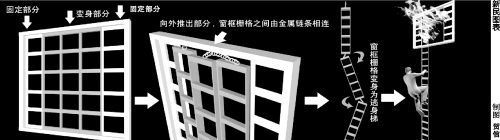 胶州路高层大火引起各方关注安全问题。不少读者来电讨论火场逃生良方。家住安徽繁昌的汪晓林告诉本报记者,自己业余时间研制的活动防盗两用窗,在危急时可变成一部梯子,帮助高楼遇险居民逃生。“要是能推广普及就好了。” 构思