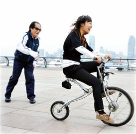 记者随后也蹬上自行车试骑了一段,发现自行车脚蹬用力和普通自行车没有太大区别,脚蹬转一圈,自行车能行驶10多米远,只是由于自行车脚蹬的位置移到前轮上,人坐在自行车上有点向后躺着的感觉。