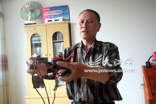 本报讯记者邹晓华摄影报道:龙建平,今年58岁,家住南昌市青山路住宅小区。他发明“电动车双向智能报警装置”是缘起于自己被盗5辆电动车。昨日,龙建平对记者说,他希望将这个发明免费提供给需要帮助的人。 发明智能报警装置