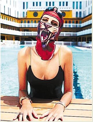 “脸基尼”是啥?说来好理解——游泳时穿在身上遮挡重要部位的衣物叫比基尼,罩在头上直至脖子的头套(露出眼睛鼻子嘴巴)就叫脸基尼。这脸基尼在网上居然还蛮受欢迎的,淘宝网上的交易量相当不错。不过也有人觉得害怕,像坏人戴的面具,有些小孩子看到,直接就给吓哭了。