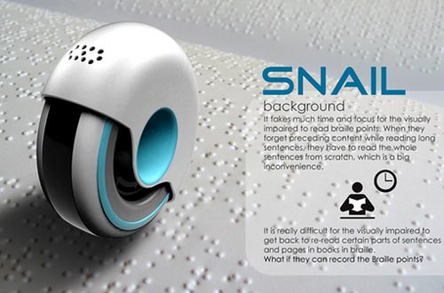 Wonkook Lee为盲人设计了一款蜗牛阅读器,只需将它套在手指上,扫描盲文后,就能通过喇叭阅读出来。附带的蓝牙耳机,可实现同步播听。此外,它还具有记忆存储功能,盲人可以将想阅读内容预先存下来,需要的时候回放即可。