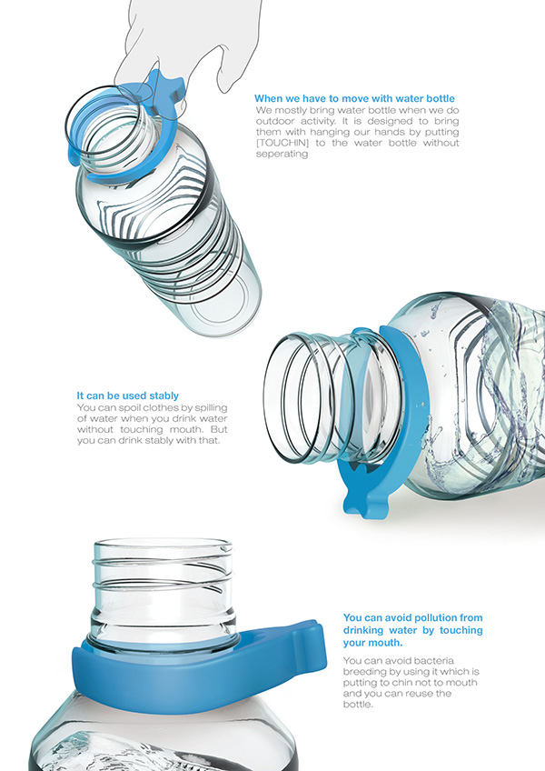 现在饮料或者矿泉水的旋转瓶口包装使用非常的广泛,几乎所有的国家都能看到这样包装的液体商品。然而很多人买到这样包装的饮料都会直接拧开就喝,虽然看上去很正常,但是这样是很不卫生了,因为在瓶口会有很多我们肉眼按不到的细菌。如果将瓶口和嘴保持距离,很有可能会将液体撒在嘴外面。为了让用户方便卫生的享用手中的饮料,Yun So Hyeon等人设计了这个防止细菌塑料瓶套。当用户享用瓶装饮料时,这个瓶套会像支架一样将瓶口架起来,这样就避免嘴直接接触瓶口,既卫生又方便,看上去也很美观。