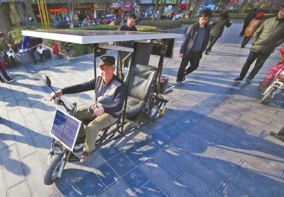 □记者赵腾飞实习生张敏文记者王亚鸽摄影核心提示|一位年近六旬的教师,利用废品收购站“淘来”的材料,自制了一台太阳能电动车,不仅环保,性能也很优异。连续几日,该老人都会带着他发明的“拉风”太阳能车到洛阳老城青年宫广场进行展示,并向市民宣传环保知识。他说他有一个愿望,就是要骑着自己发明的电动车,带88岁的母亲环游全国。
