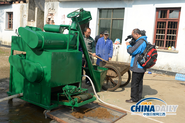 一堆猪粪,几分钟后变成了可以喂养鸡鸭的优质饲料,这可不是天方夜谭,在新余市分宜县一家养猪场里,乡村发明家罗根根向中国日报网记者演示了怎样从猪粪中提取饲料,用他自己发明的一台机器。中国日报网记者现场见证从猪粪中提取饲料