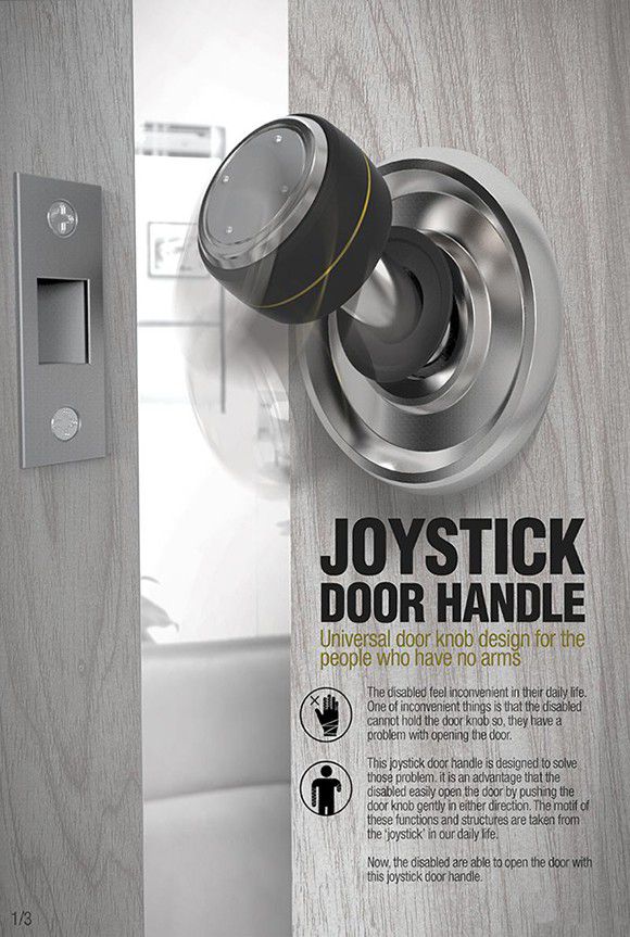 这属于一个通用设计吧,残疾人出门开门总是有些不方便的,还有就是被物品占用双手的人,看设计师是怎样解决这个问题的吧。这个360°可旋转的把手来帮助你,不论用肘还是手腕还是嘴巴,都能轻轻松松进到门里面去!