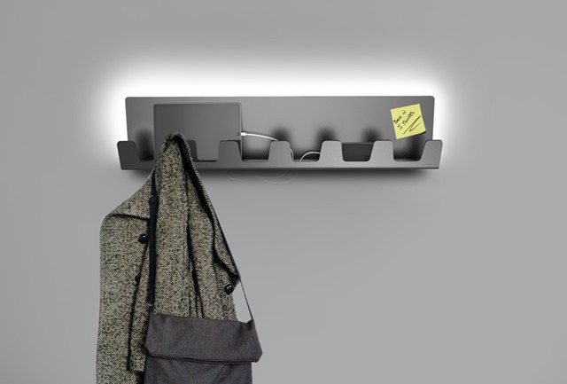 设计师 David Carrasco Barceló 设计的简约衣架,除了挂衣服之外,添加了USB端口,回家后挂上衣服,将手机放置在架子上充电。