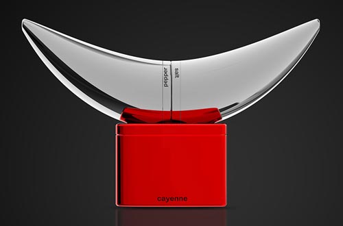 Arthur Xin设计的牛角椒盐瓶,盛装胡椒粉和盐的不锈钢器皿外形来自牛角造型,两部分底部利