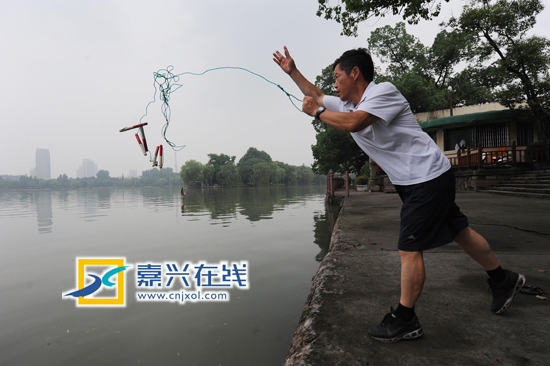 嘉兴在线7月21日讯 今天下午,南湖东岸边资深游泳爱好者杭嘉生正在试用他的新发明——便携救生绳,刚刚获得国家知识产权局颁发实用新型专利的这个便携式救生装置,一改普通救生圈携带不便、抛扔距离近的缺点,是杭嘉生多年开展公益水上救援工作的创新之作。杭嘉生对记者说,如果有机构和市民需要,他愿意无偿提供设计专利。