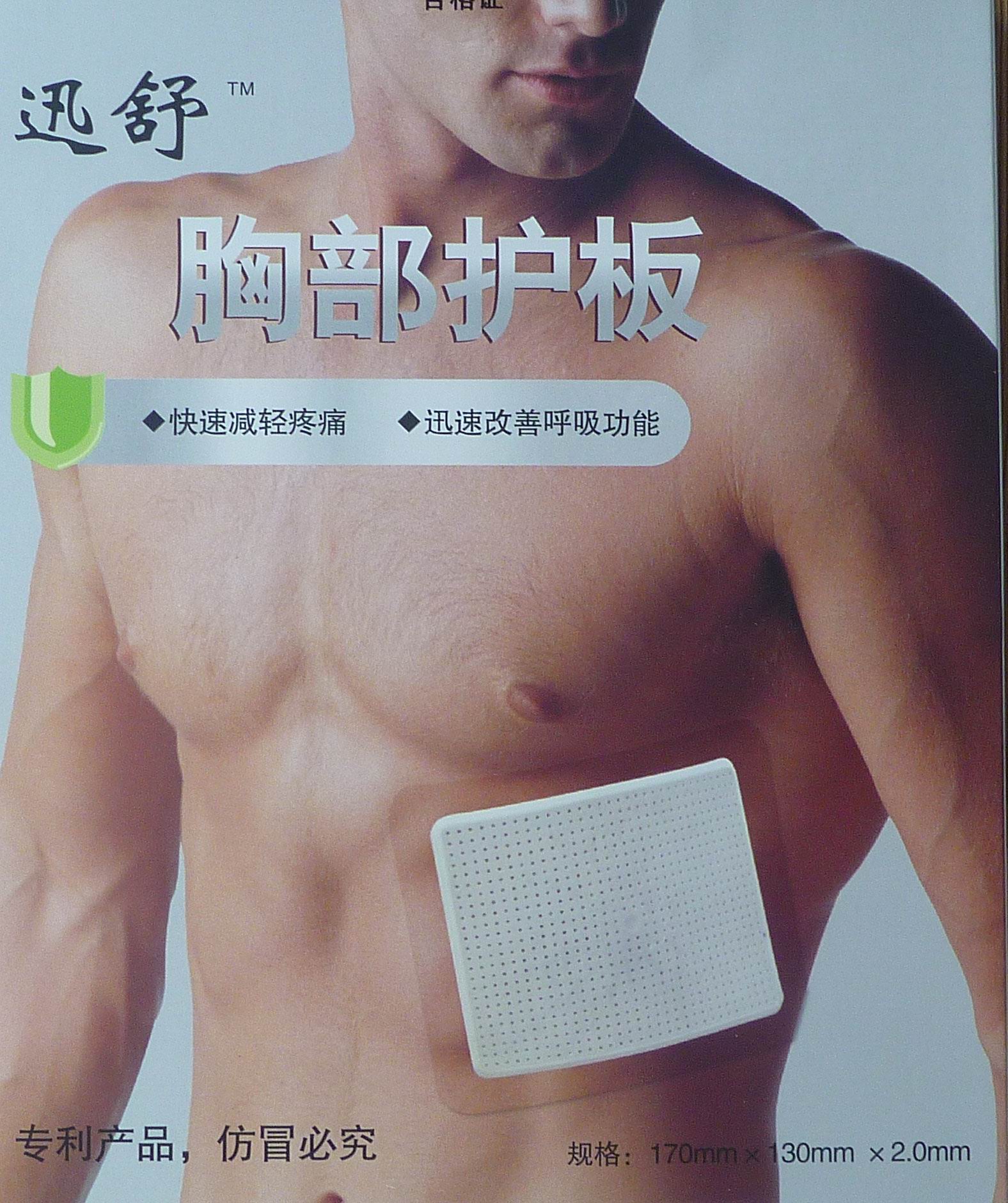 一,产品特点 1、快速减低疼痛、迅速改善呼吸功能,预防肺炎发生、缩短愈合周期; 2、由高分子纳米材料制成,结构新颖,重量极轻,操作简单; 3、合体性极佳,骨折部位固定性好; 4、护板表面采用低敏性材料,亲肤性强,具有良好的透气性; 5、可被X射线穿透; 二,传统固定方式的缺陷 传统治疗方式为胶布固定法、胸带固定法。 缺陷:1、固定效果不佳所有传统方法均缺乏刚性结构,不能在骨折部位使肋骨骨折端和周围正常的肋骨形成一个刚性板状结构,很难限制肋骨骨折端随呼吸、咳嗽等运动时出现的位移,故止痛效果不理想。 2、限制呼吸运动传统的胶布和胸带固定治疗肋骨骨折的方法,在固定胸壁的同时也使伤侧呼吸运动受限,咳嗽动作受抑制,易导致肺不张。甚至加重浮动胸壁的内陷和肺损伤,限制肺扩张,使呼吸更加困难。严重会导致淤积性肺炎。 3、引起皮肤过敏 传统的胶布固定法对于很多患者不适应感强烈,容易引起皮肤过敏。 4,肋骨骨折的治疗状况:因为传统固定治疗方法的缺陷,现在肋骨骨折的治疗现况是服用镇痛药和卧床休息。 三,胸部护板的作用机理 利用胸部护板的合体性和刚性,使肋骨骨折端和周围正常的肋骨形成一个刚性板状结构,在完全不限制胸廓运动的情况下, 护板能限制肋骨骨折端随呼吸、咳嗽等运动时出现的位移, 局部不再有继发性损伤,疼痛就会大大减轻,从而达到止痛、恢复呼吸功能、降低肺部感染发病率的目的。 加盟热线18607127286(专利保护10年)