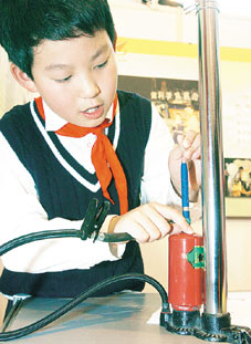 4月30日,南京市北京东路小学五年级的陈一川同学正在向参观者介绍他发明的“打不爆车胎的安全打气筒”。当日开展的“江苏省青少年创新成果展”上,共展出了我省青少年发明成果的各类图片1000多张,实物100多件。 本报记者 肖 勇摄 扬子晚报