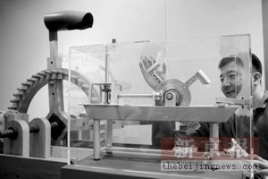 工作人员在观赏一条船的内部构造模型。昨日,北京自然博物馆展出了34件由达·芬奇设计的模型。本报记者韩萌摄 500年前手稿设计被制成模型,将在自然博物馆展出两个月