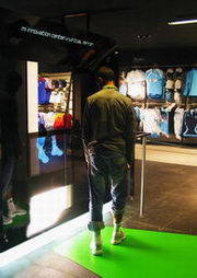 巴黎的一家商店现在已经采用了这项新型鞋子试穿技术,预示着乏味单调的不停地换鞋子的时代即将结束。你无需在十几双鞋子中间换来换去,只要站在一个虚拟镜面前即可完成这一过程。如果你的脚上穿着你最喜爱的红条纹鞋模型,还可以选择金色皮鞋进行比较。巴黎香榭丽舍大道的阿迪达斯最现代化专卖店(Avenue des Champs Elysées)在世界范围内最先应用了这项技术。 虚拟镜技术是由德国弗劳恩霍弗研究所(Fraunhofer Institute)原柏林海因里希-赫茨通讯技术研究院开发的。 与传统的镜子不同,这种虚拟镜呈现的不是一个真实的影像,它通过一个摄像机捕捉顾客的脚和腿,然后将它们的视频在一个监控器上显示出来。各种不同的鞋子模型可以被插入到这个画面中。虚拟镜的研发人员之一尤根卢因斯基说:“非常感谢海因里希-赫茨研究所开发的三维图像处理技术,这种软件处理速度很快,可以实时地跟踪顾客的运动。”被称为信息空间的展示区域也是由海因里希-赫茨通讯技术研究开发的,它可以以图片广告点和小电影的方式展示来自运动服装制造商的各种鞋子和服装。与触屏技术不同,顾客浏览菜单时不用触摸任何物体,他所要做的只是在大约80厘米远的地方指向屏幕即可。实现这种功能的是一种被称为手指追踪系统。安装在天花板上的立体摄像机拍摄下手指的图像,并计算出它的空间位置以及它所指的方向。