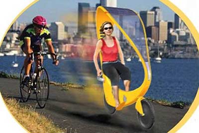 事实上,它就像电动自行车一样,只不过它可以利用太阳能为发电机电池充电,安装在自行车顶部的大天蓬能够大面积地吸收太阳光。白天可将自行车停放在办公室外面进行充电,以备下班后骑车回家。即使是天气不晴朗,质量上等的太阳能电池依然可以吸收到所需的太阳能热量保证自行车正常使用。夜晚的时候,自行车上有一块小电池,也能坚持使用数小时。为了节省能量,在从陡坡向下行驶过程中,可以将发动机关闭,上坡时再将其打开。