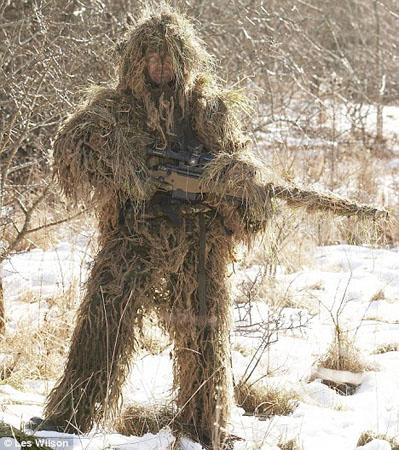 最近,在英国威尔特郡沃明斯特镇陆上作战中心支援武器学校,一些英国狙击手进行了雪地环境下的武器和伪装训练。一名化名“雅皮士”的士兵说:“你可以把它们叫做定制迷彩服。这件是把绿色布条缝在布料表面,上面再盖上枯草,绑紧。制作这件迷彩需要3个月的时间,也需要很大耐心。”