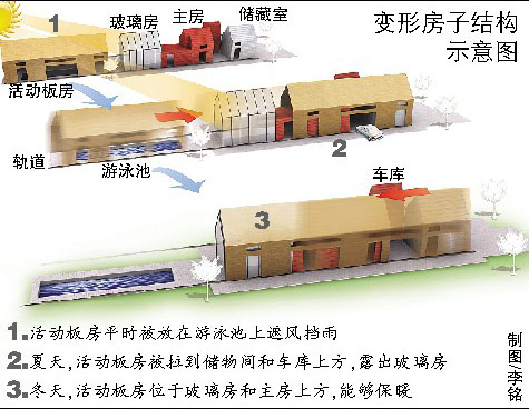 这个外壳搭建在轨道上,只需按一个按钮就可以在轨道上自由滑动,分别覆盖卧室、庭院、全透明的玻璃客厅,甚至是游泳池。