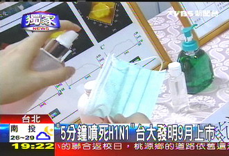 这种用“台大病毒崩”为原料,制造出的这种号称能杀死甲型H1N1流感病毒的喷剂是台经济主管部门委托台大团队,花了6年时间,从研究SARS病毒的经验里,找出甲型H1N1流感病毒的克星。虽然还没做动物实验,却抢先在台湾、日本、美国申请专利,预计第一批要制造1万瓶喷剂,招商说明会,近30家厂商抢破头。喷剂业者:“个人防护的部分,针对(杀死) 甲型H1N1流感、肠病毒,还有金黄色葡萄球菌跟禽流感。”