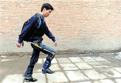 8月中旬,欧阳俊到周口店玩,他背的食物和水足足有20斤重。“越背越沉,肩膀被勒得生疼。”于是他就想发明个机械装置,来“帮”自己背包。“我想到通过机械原理,将包的重量分散或转移,离开身体。”欧阳俊用一周时间画出图纸,然后到五金市场买来各种材料,经过反复试验、改装,昨天下午,他做的第二个背包架终于成功了。欧阳俊绑上背包架,就像个机器人,20斤的背包挂在架子上,力顺着支架被卸到地上,人走起路来显得很轻松。“这个支架根据人体工学设计,绑在身上不影响走路。”
