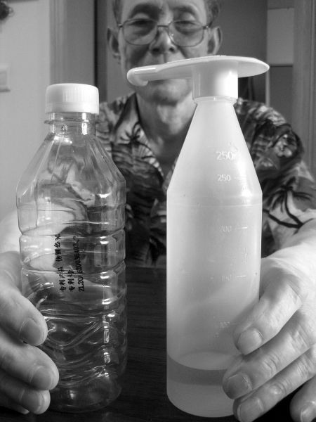杨生民发明的清洁器 本报讯(实习记者李鑫摄影报道)杨生民拿起一个看似很普通的透明塑料瓶,装了大约150毫升水,然后拧紧瓶盖。只见他轻轻一捏瓶身,一股细小的水柱从瓶盖延伸处喷了出来。