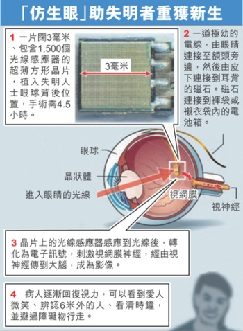 据报道,“仿生眼”由德国公司Retina Implant AG发明,包含一片阔3毫米的微型芯片,内藏1,500个光线感应器,用以取代失明人士受损的视网膜,有望在5年内上市。来源:中国江苏网
