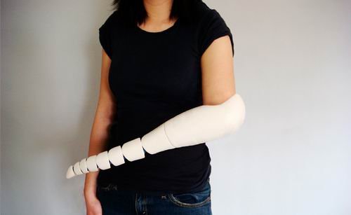 我要发布信息 | | 美设计师发明新款柔韧仿生手 可拿起任何物体 | 2010/12/13 |  | 目前,美国设计师凯莱恩-考(Kaylene Kau)最新设计的仿生手臂突破了当前仿生前手臂的传统设计,制造一种柔韧性仿生手臂,能够更容易有效地完成日常工作。这一新款仿生手臂最大的特征是柔韧性设计,能拿起不同外形的物体,该仿生手臂还结合了马达转子和线缆,可帮助使用者在不同任务中控制盘卷力。基于简单有效的设计,该仿生手臂使残疾人群变得“独断专利”,可以在无需任何援助下完成每天的工作和任务。(cnbeta.com)