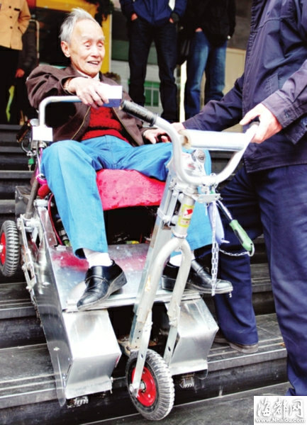 东南网-海峡都市报4月13日讯(见习记者 汤先增 文/图)昨日上午,在福州市五一中路先施大厦门口,一位八旬老人坐在一辆电动多功能“上下楼梯车上”,正在台阶上演示,引来众多市民驻足观看。这辆车上下楼梯平稳自如,无冲击现象发生,运行时靠齿形橡胶圈接触在台阶上,可有效防止下滑,省力省时,许多残疾朋友观看后纷纷表示望能早日投产。记者看到这辆电动多功能上下楼梯车长约1.2米,宽约0.8米,主要由轮椅和履带组成,就像一张残疾人坐椅搭在了一袖珍坦克的履带上。正在演示的老人叫张瑞钧,是一名83岁的老科技工作者。他告诉记者:“发明这辆轮椅花了十多年,几经改进才研制成功,还取得了国家专利。”据了解,当年张瑞钧因为一位残疾朋友上下楼梯都要靠人背,自己痛苦,别人费劲,这才触动他研发上下楼梯代步工具,他说,残疾人朋友有了这种车,这一难题将会迎刃而解。