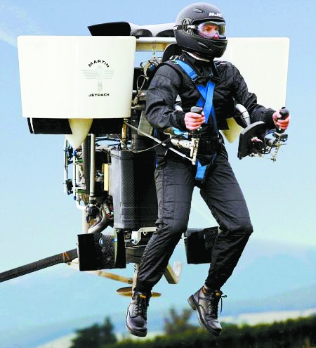 世界上第一种商业单人喷气式飞行背包在几个月内将上市销售。 这项装备的发明人格林·马丁说:“你要做的,只是把你自己绑上去,启动马达,然后你就飞起来了。”至于设计的原理,马丁说:“这只是最基本的物理学原理。正如牛顿所说的,作用力和反作用力相等。因此当你的背包向下喷气时,你就往上飞了。”