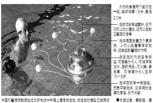 我要发布信息 | | 沈阳人发明的“救生舱”永不侧翻 造价6万元 | 2011/07/03 |  | 大学教授发明的海上漂浮救生舱可救10人 造价只有6万元左右 晨报讯(记者 王皓)看起来像两个大盆扣在一起,它不仅能在水中悬浮,而且永远不会翻。在海啸、洪水等灾难发生时,它可以救10个人脱离险境。 沈阳的一位大学教授赵成文发明了海上漂浮救生舱模型。 灾难来临时 它可以救10个人 近日,记者见到了中国刑警学院教授赵成文。“5年前就有做这个海上漂浮救生舱的想法了,它是我的《一种红匣子》专利中的二号(一号用于矿难救援),2006年已经获得了国家专利,但是这些年一直没有时间做出来,这次日本海啸激发了我把它做成型。”赵成文告诉记者,他用了两个月时间完成了模型制作。 记者看到,海上漂浮救生舱的外形就像是两个盆扣在一起,据赵成文介绍,舱体顶部有避雷针,它不仅可以防止雷击,还可以发射卫星定位信号;舱体底部有一根锚链,负责平衡舱体,它采用钓鱼漂的原理,在水中可以像不倒翁一样,永不侧翻;舱体周围拴着四个悬浮球。 “这次日本海啸大多都是泥沙,这时悬浮球的作用不仅是可以产生浮力,还能起到警报的作用。”赵成文说,“在关键时刻,这些悬浮球还能救命,里面的座位有限,其他人可以抱着悬浮球救命,隔一段时间与里面的人换一下,这样救10多个人没有问题。” 成本6万元 希望让中国人来生产 为了演示海上漂浮救生舱的基本原理,赵成文在游泳池里做了实验。 记者看到,模型能稳当地悬浮在水中,即使身边有人游过,它也不会有太大的波动,更不会翻船。 赵成文告诉记者,这个模型是按照1比20的比例制作的,实体舱高1.8米,直径2.0米。那么我们什么时候才能看到它的真品呢?赵成文透露,目前已经有国外的企业与他联系,想要投入生产,“它是由我们中国人自己发明的,我还是想让我们中国人自己来制作、生产。” 赵成文透露,制作一个救生舱的成本在6万元左右,“它就跟汽车一样,配置越高,成本越高,基本配置的6万元就够了。” 记者了解到,在设计出海上漂浮救生舱的同时,赵成文还正在紧锣密鼓地设计“节能抗震活动房”。 赵成文是中国刑警学院首席教授,著名刑事相貌专家、痕迹考古学家,政府特殊津贴享受者。他从警近30多年来,破获三千多件大要案,还拥有多项发明创造。除了《一种红匣子》获得了国家专利,他还有五项专利,其中有的获得国家优秀专利奖乃至国际金奖。 外形就像是两个盆扣在一起,实体舱高1.8米,直径2.0米 舱体顶部有避雷针,它不仅可以防止雷击,还可以发射卫星定位信号 舱体周围拴着四个悬浮球,人可以抱着悬浮球救命,还能起到警报的作用 救生舱的内部设有软座,可容装5~6人,可储存有淡水、医药用品、灭火器、食品等,可保障5~6人生存10~15天 舱体底部有一根锚链,负责平衡舱体,它采用钓鱼漂的原理,永不侧翻.[来源:华商晨报] |