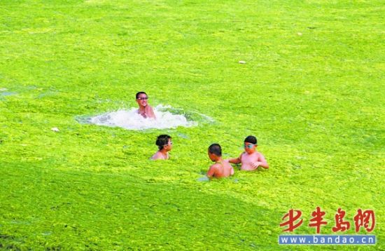 "浒海" 7月14日,第一海水浴场内,虽然大面积浒苔的到来给岛城带来了不小的麻烦,可丝毫没有影响孩子们兴致,他们在一片"浒海"中玩得特别开心。本报见习记者 吴璟 摄