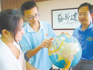 陈天章和指导老师向记者介绍他的新式地球仪。 陈天笑 摄