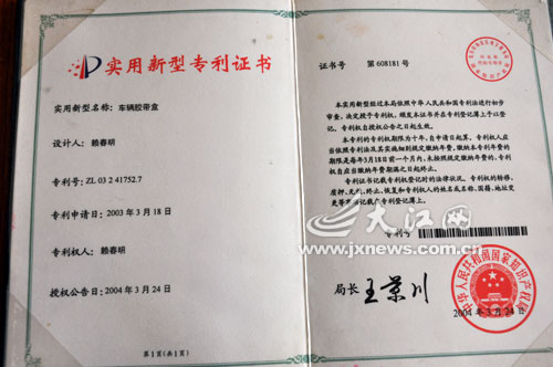 赖春明是安远县欣山镇上角村农民。一次,他在集市上买了化肥要往回赶,发现绕在摩托车后架上用来捆绑物品的胶带不见了,环顾左右也没找到。他突发奇想:为什么不能制作一个装胶带的盒子固定在车架上呢?几经周折,他发明的“车辆胶带盒”出炉。抱着试一试的心态,他向国家知识产权局递交了专利申请。没过多久,这项产品真的获得了国家实用新型专利证书。从此,赖春明在小发明的路上一发而不可收,制作完成了无结方便盒、快速导向板、神奇多功能削皮器扣等5项实用新型产品,其中2项已经获得国家专利。但是,他的发明热情很快就被现实“泼”了冷水:长期的发明和经济投入,让他负债累累,生活几近困境。在家庭和生活的压力下,赖春明只好放下心爱的发明,在县城租店面开了家“老赖防水涂料”站,一门心思挣钱讨生活。