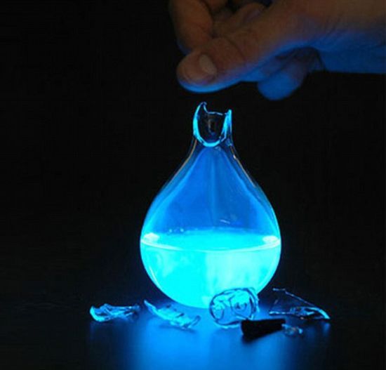 你可以设想一下,把灯泡顶端打碎,然后用锯齿状碎玻璃割破你的手,让流出来的血流进灯泡中,接着鲜血和里面的化学物质发生反应,就会产生蓝辉光。研制者迈克-汤普森说,他设计这种灯泡的用途只有一个,就是“让我们重新考虑我们的一次性社会”。