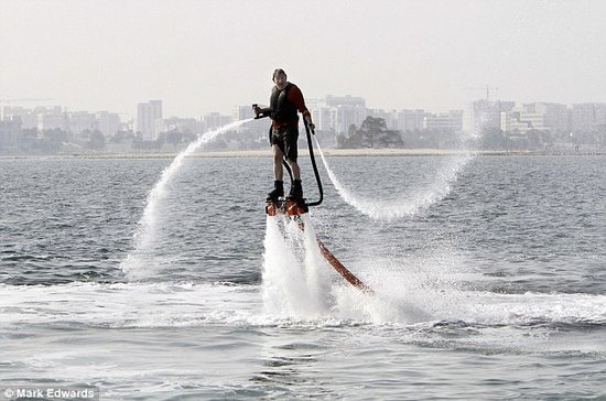 近日,一个完整的“人类海豚”出现在卡塔尔海域,从一定意义上这是人们看到最奇特的水上发明装置。事实上,即使一个完全的新手都能在1-2个小时熟练掌握这种最新发明,并且很快地进行控制。就在1年前,前世界水上摩托艇冠军弗兰克-萨帕塔在水面上进行了精湛的表演。过去几年里,工程师试图彻底改造水上摩托艇——喷水动力水面摩托。目前,这位法国男子弗兰克-萨帕塔提出一项设计理念,水从一块小冲浪板底部和一对入水孔中吸入,经过一根较长的软管排出,这样一个水上喷水背包诞生了。仅在短短几周之内,萨帕塔设计的这个原型不仅让他盘旋在水面上空30英尺处,还能让他像海豚一样潜入水中。2011年秋季,他发布了一段视频到YouTube网站,很快点击率骤升。时隔一年,萨帕塔现已接收到1500多件定单(大约每个水上喷气背包售价5000英镑),并在法国马赛老家附近开设了一个小型工厂。