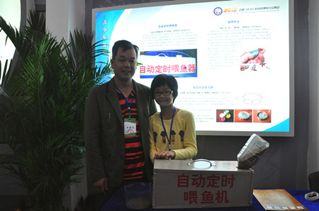 中国日报湖南双语网10月28日讯 高手在民间,在2012长沙科交会上,来自民间的草根发明家们带着自己精心设计制作的宝贝前来参展,并不大的民间科技发明展示区里却聚集了极高的人气,前来参观的人络绎不绝,记者新奇的发现来参展的中小学生比较多。“以前爸爸叫我给家里的鱼喂食的时候我总是会不时的忘记,那时候我就在想我可不可以发明一个自动定时喂鱼机,那样就不需要我时刻记着要去给鱼喂食了。”今年还在读六年级的彭程珍同学向记者透露了自己当初设计这个自动定时喂鱼机的初衷。今天她就带着自己设计、自己动手和爸爸一起制作的小发明来到了长沙科交会的民间科技发明展示区进行展示。