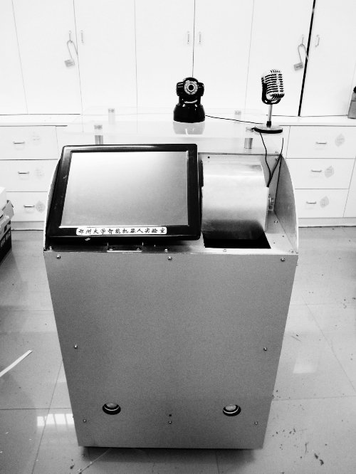 郑大学生发明的储物柜,长宽均约60厘米,高约1米,柜上有很多小格子,外面连着麦克风、摄像头。