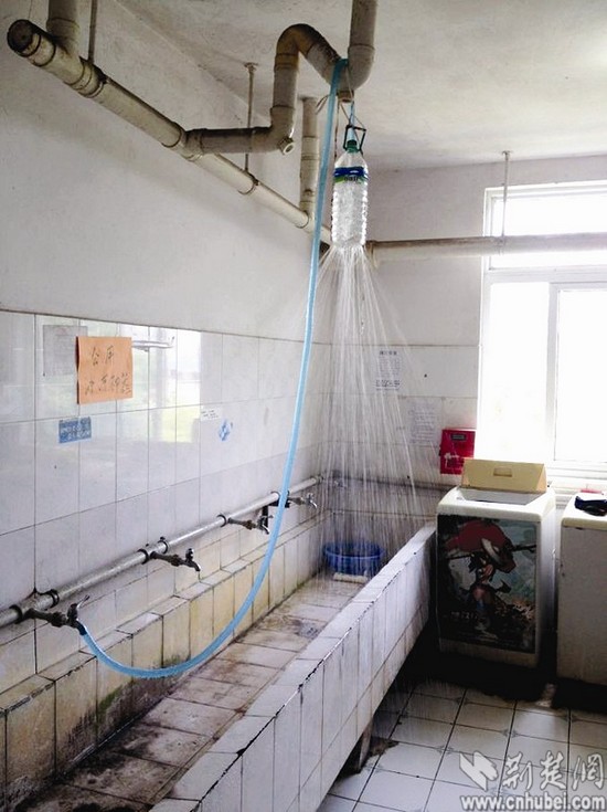 原来,这个简易的淋浴装置出自刘畅的两位男同学之手。据其中一名苏同学介绍,制作材料很简单——到杂货店花5元钱买了一根塑料管,一头接在水龙头上,一头用电烙铁焊在饮料瓶盖上,这样也解决了漏水的问题。“做好后一试,效果还挺好,就挂在那里,供大家公用。这两天用这个洗澡的同学还真不少,要是用不过来了,我们就再做两个。”苏同学告诉记者。(见习记者朱蕾 通讯员王鹏程 胡小丽)来源: 荆楚网
