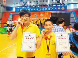 宁陕中学高一学生刘飞和李弋(左一)喜获金奖本报安康讯 7月19日上午,在乌鲁木齐举办的第十四届中国青少年机器人竞赛上,代表陕西队的安康市宁陕中学高一学生刘飞和李弋两名学生获得了此次机器人创意比赛高中组金奖,这是陕西代表团创意项目历届比赛以来获得的首枚金牌。