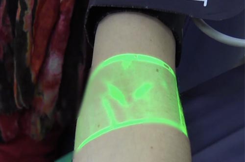外线光,血管中的脱氧血红蛋白吸收红外线后,血管会变成绿色在皮肤表面显现出来,从而让医