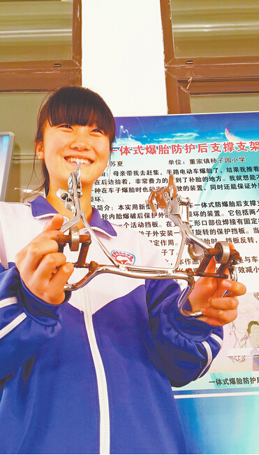 我要发布信息 | | 济南13岁小妮发明"推得容易" 避免电瓶车爆胎推不动 | 2014/11/09 |  | 历城区董家镇柿子园小学学生苏夏与她发明的“推得容易”。 记者潘奕轩 摄 电动车爆胎了,推不动怎么办?历城区董家镇柿子园小学苏夏发明了在电瓶车支撑架上安装两个轮子,避免电瓶车爆胎后推不动的情况发生。周围邻居看了苏夏的发明,也要求在自己的电瓶车上安装这个装置,这项小发明已经被悄悄运用到实际生活中。 车撑子上焊接了一指粗的铁条,铁条上连接了两个滚轮,滚轮由螺丝固定,拧开螺丝滚轮可进行折叠伸缩……6日下午2点多,在历城区第四届青少年科技创新技能大赛颁奖典礼现场,记者见到了手拿“推得容易”的大眼睛女孩苏夏,13岁的她就是这个发明的创作者。为啥想起发明“推得容易”?苏夏告诉记者,母亲带着她去赶集,半路电动车爆胎了,由于电动车很重,一个人无法推动,即便是能推动,推不出10步就没有力气了。“我在前面把住车把使劲往前推,妈妈在后边推,很费力才运到了补胎的地方。”苏夏说,自打这件事发生后,她就琢磨着能不能发明一种在电动车爆胎时也能行驶的装置,同时还能保证外胎不受到损坏。 苏夏突发奇想,能不能在车撑子上安装上轮子,这样推起来就能省力了。于是苏夏花32块钱买了一个电动车的车撑子开始在家里做实验。她找到一个修理电动车的地方,让其帮着把两个小滚轮焊接到铁条上,将铁条焊接到车撑子上,焊接的费用和轮子钱共花了不足20元。就这样,“推得容易”做好了。“我实验了四五次,发现没问题就在自己家的电动车上安装了这个支撑支架。”苏夏表示,自己同班同学发现这个车撑子的好处后,也安装上了这个发明,现在已经有4个人安装了“推得容易”。 苏夏的指导老师董家镇柿子园小学赵福泉说,这个发明已经申报专利了。与现有技术相比,苏夏发明的“推得容易”有益效果是与车子成一体,不用专门携带,它能够适应较长距离的推行,减小推行过程中的阻力,并提高推行的舒适度。 记者了解到,苏夏发明的“推得容易”获得第28届全国青少年科技创新成果大赛一等奖。这项源于生活的创作灵感,具有很强的实用性。苏夏希望今后自己的发明能够投入生产,让更多常骑电动车的人,不被爆胎推不动车子所困扰。 近年来,历城区共有25名同学在全国中小学生电脑制作大赛、全国青少年科技创新大赛中获奖,成为济南市获奖最多的县(市)区,而且获奖学生全部来自农村学校。其中,全国中小学生电脑制作大赛一等奖9人,在山东省名列前茅。历城二中有13名学生因为获奖被保送到全国名牌大学或享受高考加分。来源: 舜网-济南时报 |