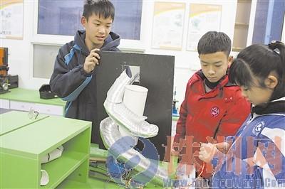 ▲黄淑敏(右一)和同学在研究如何改进“校园高楼火灾事故救援安全逃生梯” 通讯员 凌长根供图 枫叶中学初二女生黄淑敏、刘洋昆、刘铭洋发明的“校园高楼火灾事故救援安全逃生梯”征服了评委会人员,拟获青少年科技创新奖三等奖。此外,该发明还在上个月结束的第八届国际发明展览会上,与来自美国、德国等38个国家和地区的3000项发明成果竞争,获得了金奖。