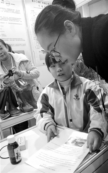 图为广州市白云区培英实验小学的小朋友在推介自己的作品“一种提示盲人药量的装置”。蔡滨摄