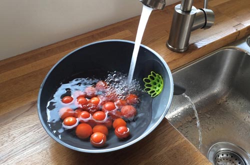 由caveman factory设计的anton滤斗碗,这只碗特别添加了一只巧妙的漏斗把儿,在浸泡果蔬等食物之后,很容易就能把剩下的水排倒在水槽、杯子或者是室内植物里。它还可以作为一件普通的容器,把水果和饭菜端上餐桌。