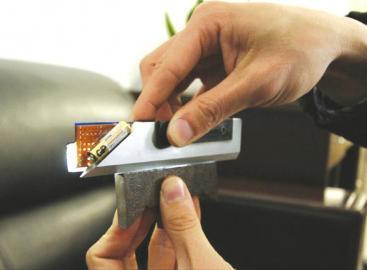 为克服这一难点,2013年9月开始,彭彩浩、张杨、伍鸿平三位教师便开始构思,然后选择光源,制作LED铁片灯,并攻克了焊接等系列难点,耗时1个月成功研制出新发明—自带光源的光口尺。该发明在光口尺的一侧固定有电路板,电路板的下端设置有发光二级管,电路板连接有电源,同时在电路板外侧固定有反射柔光罩。