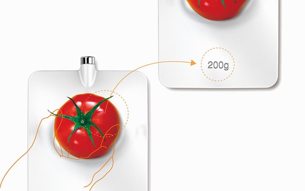 Scale 是一个柔软的称重工具,通过向里面灌入自来水。在上面放置上称重食品后,我们可以明显看到食物重量带来的下沉变化,并且也会 LED 显示重量。