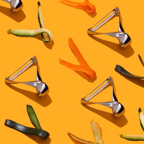 曲面形态,削皮器的把手模仿了一条果皮或蔬菜皮弯折扭曲的形态,不仅十分别致,还有效避免