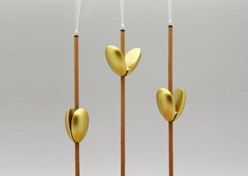 由张剑设计的燃香阻燃器,是金属制成的两瓣小芽,燃香时选择需要燃烧的长度,将两瓣芽靠磁铁吸附在香柱上,当香燃烧到金属芽底部圆孔位置时,燃香遇金属阻隔自然熄灭,达到控制香燃烧长度的目的。香熄灭后与阻燃器形成一个破土而出的“芽”造型,寓意着“祈福”萌发出希望的“嫩芽”。