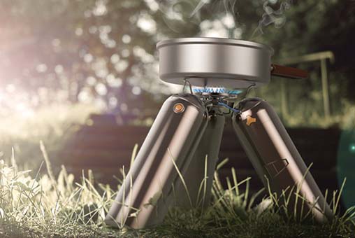 设计师们设计了户外煤气灶,造型跟古代生火一样,三角的形状,不过它是装煤气罐的,更方便在外煮食。